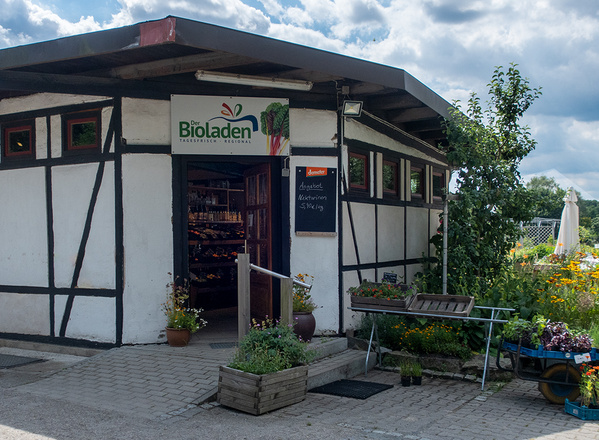 KI generiert: Kleiner Bioladen mit offenem Eingang; Tafeltext: "demeter degustation Mittwoch 5€ / 1g".