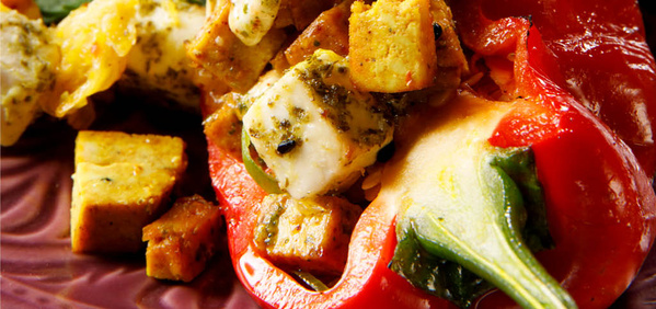 Möhre in feine Streifen schneiden und die Orange filetieren und würfeln. Die Zwiebel in Würfel schneiden und in etwas Olivenöl anschwitzen. Möhrenstreifen und Orangen kurz mit anbraten. Die Lauchzwiebel in feine Ringe und den Tofu in Würfel schneiden. Alle Zutaten bis auf die Spitzpaprika in einer Schüssel miteinander vermengen und mit Kreuzkümmel, Salz und Pfeffer abschmecken. Die Spitzpaprika längs halbieren und entkernen. Mit der Gemüsemischung füllen und im Backofen bei 150° C ca. 25 Minuten garen. Schneller Dip dazu: Naturjoghurt mit etwas gehackter Minze verrühren. Mit Salz und Pfeffer würzen, fertig!