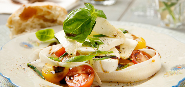 Weißen Spargel schälen, die unteren Enden abschneiden und die Spargelstangen mit dem Sparschäler in feine Streifen schneiden. Rote und gelbe Cherrytomaten halbieren, Knoblauchzehen und Schalotten fein hacken. Mozzarella achteln. Alle Zutaten zusammen mit dem Olivenöl vermengen und mit Salz, Pfeffer und 1 Prise Rohrohrzucker abschmecken. Mit etwas Balsamicoessig beträufeln und Basilikumblättern garnieren – fertig!