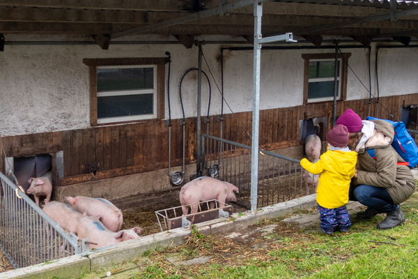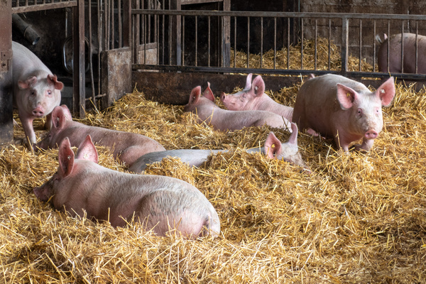 Auf dem Hof werden durchschnittlich 200 Schweine auf Stroh nach Bioland-Richtlinien gehalten. Die Ferkel stammen von dem ökologischen Sauenstall des Landwirtschaftszentrums Haus Düsse in Bad Sassendorf, der ebenfalls bei Bioland anerkannt ist. In 10er Gruppen werden sie zunächst in einem Vormaststall gehalten, hier ist das Futter etwas eiweißreicher als in der späteren Endmast. Die Ferkel haben einen warmen Liegebereich im Stall und einen Auslauf für die aktiven Zeiten des Tages draußen. Wenn die Schweine älter sind ziehen die Gruppen in größere Buchten um. Der Endmaststall ist komplett offen, so dass die Schweine das ganze Jahr bei Außenklima im Stroh wühlen können. Für die Ruhephasen hat jede Gruppe eine wärmegedämmte Liegebox, in die sich die Schweine zurückziehen können. Diese größeren Schweine bekommen drei Mal am Tag eine Mahlzeit aus selbst angebautem Getreide. Für die Schweine werden Weizen, Gerste, Triticale, Erbsen und Ackerbohnen auf dem Hof gemahlen und mit ein wenig Mineralfutter vermischt, zudem bekommen alle Schweine Raufutter. Das Raufutter ist für die Schweine zusätzlich zu dem Stroh in der Einstreu eine gute Beschäftigung. Daher ist die Gabe von Raufutter bei Schweinen ein wichtiger Teil der artgerechten Tierhaltung.
