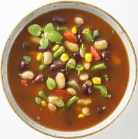 Früher galten getrocknete Bohnen als Zählsteine beim Spiel. Mit dem richtigen Rezept kann man aber auch eine ausgesprochen leckere Suppe daraus machen! Für unsere beliebte vegetarische Mexikanische Bohnensuppe haben wir ein buntes Dreierlei von Bohnen mit fruchtiger Paprika und gelbem Mais gemixt und zu milder Schärfe fein gewürzt. So einfach kommt ein deftiger und kräftigender Bohneneintopf zur abwechslungsreichen Mahlzeit auf den Tisch.
