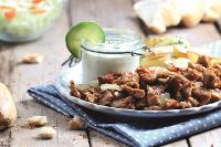 78 % Seitan* (Wasser, WEIZENprotein*), ölsäurereiches (High-Oleic) Sonnenblumenöl*, Zwiebeln*, Gewürze* (enthält SELLERIE* und SENF*), Steinsalz, Hefeextrakt*, Verdickungsmittel: Johannisbrotkernmehl*.