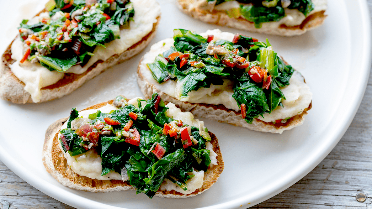 Belegte Brote zum Abendbrot müssen nicht langweilig sein! Wie wäre es statt dem klassischen Käsebrot zum zum Beispiel mit diesen raffinierten Crostini? Die kleinen Leckerbissen sind knusprige Baguettescheiben bestrichen mit einer mediterranen Bohnencreme und belegt mit gedünstetem Mangold. Klingt kompliziert? Geht überraschend schnell und steckt voller Vitamine und dank der Hülsenfrüchte auch voller pflanzlicher Proteine!
