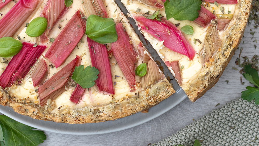 Währenddessen Frischkäse, Quark, 75g Parmesan, Zitronenschale, Eier und 0,5 TL Salz in eine Schüssel geben und verrühren. Die Füllung auf den vorgebackenen Teig geben, glatt streichen und für 30 Minuten auf der untersten Schiene backen. Rhabarber abtropfen lassen und mit einem Küchentuch leicht trocken tupfen.Den Kuchen aus dem Ofen nehmen und nach Belieben mit Rhabarber belegen. Weitere 10 Minuten auf der obersten Schiene backen. Auf einem Gitter 10 Minuten abkühlen lassen. Lauwarm mit frischem Basilikum, Petersilie oder Salbei bestreut servieren.
