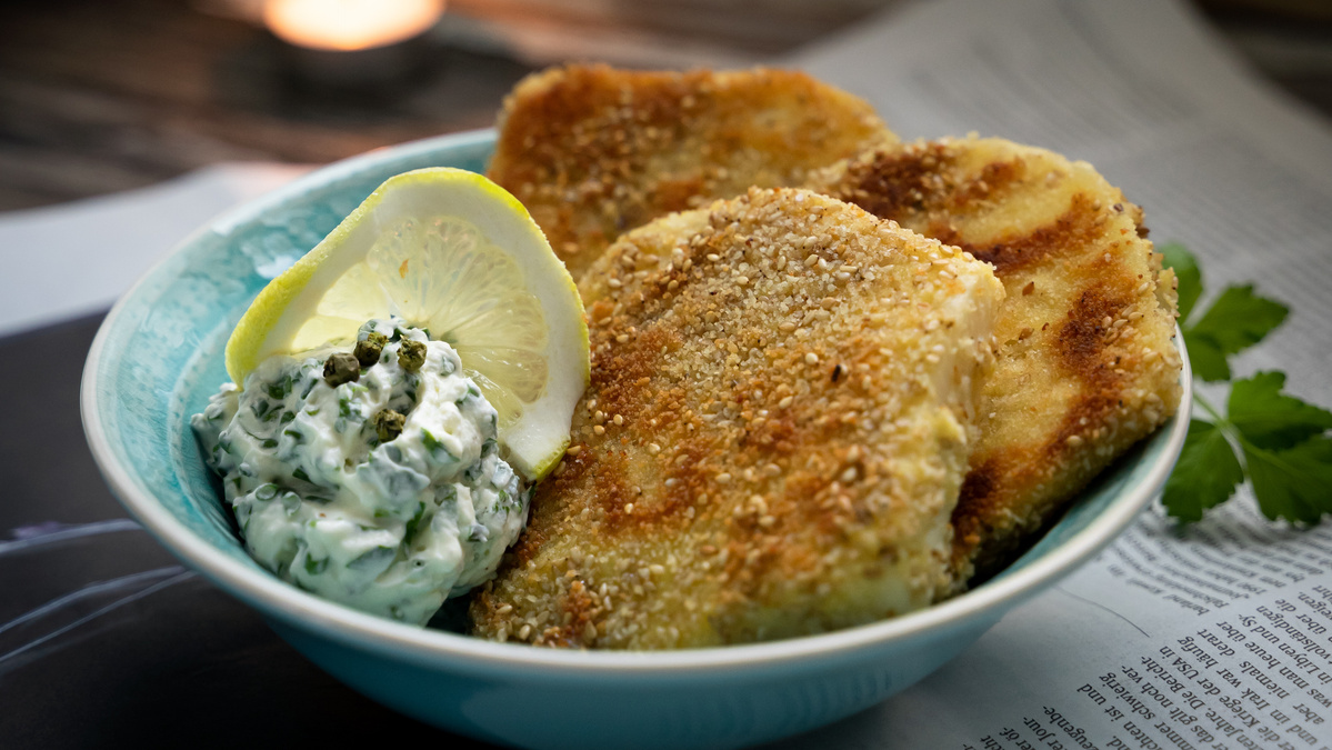 Selleriescheiben zunächst in Mehl, dann in der Ei-Milch und schließlich in Semmelbrösel-Sesam-Mischung panieren und in Bratöl auf beiden Seiten jeweils ca. 3 Minuten ausbacken.