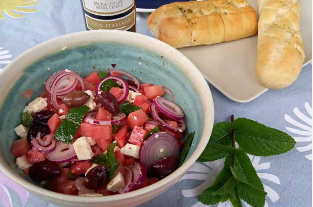 Kerne entfernen und das Fruchtfleisch in 3 cm große Stückeschneiden. Feta Käse in 3 cm große Stücke schneiden. Oliven (falls nötig) entkernen. Wassermelone, Feta und Oliven in einer ausreichendgroßen Schüssel vorsichtig vermischen, die Zwiebeln mit demLimettensaft, die Melissenblätter, das Olivenöl und den Pfeffer darüber geben.