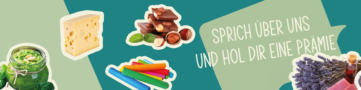 Du bist begeistert von deiner Abokiste? Dann teile diese Begeisterung doch einfach mit deinen Freund:innen und sichere dir ein kleines Geschenk. Sobald deine Freund:innen viermal bei uns bestellt haben, erhälst du das von dir gewählte Dankeschön mit deiner nächsten Lieferung. Exklusiv für unsere Neukund:innen bieten wir bis zum 22. März für die ersten vier Lieferungen einen Rabatt von 10%.